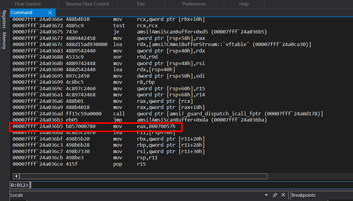 As can be seen, now the very first instruction of AmsiScanBuffer has been overwritten.