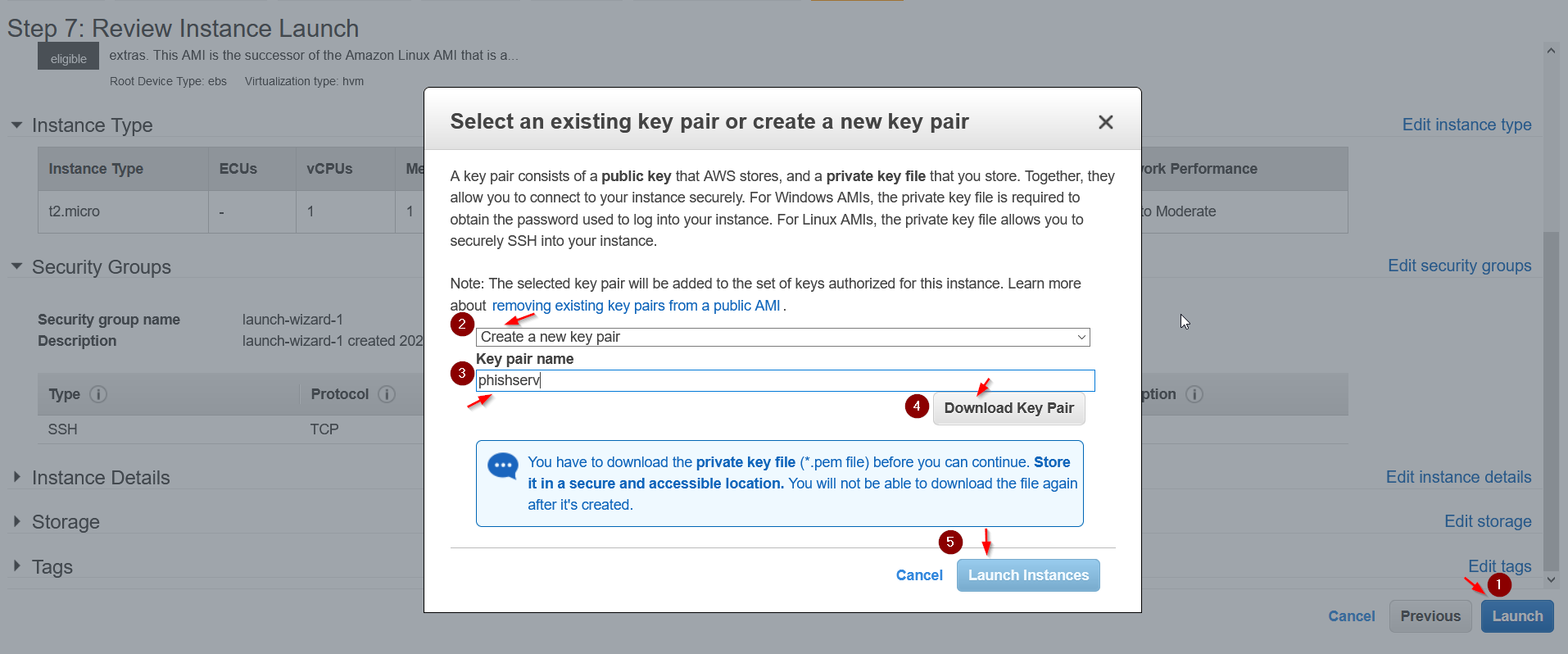 So, finally let’s click on Review and Launch. We need to create a new ssh keys so that we can ssh into our instance once it has started.