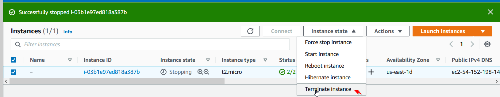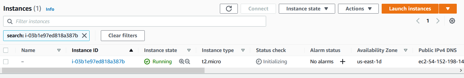 Yayyy our instance is running. When clicking on the instance name, we’ll be taken back to the instances dashboard.