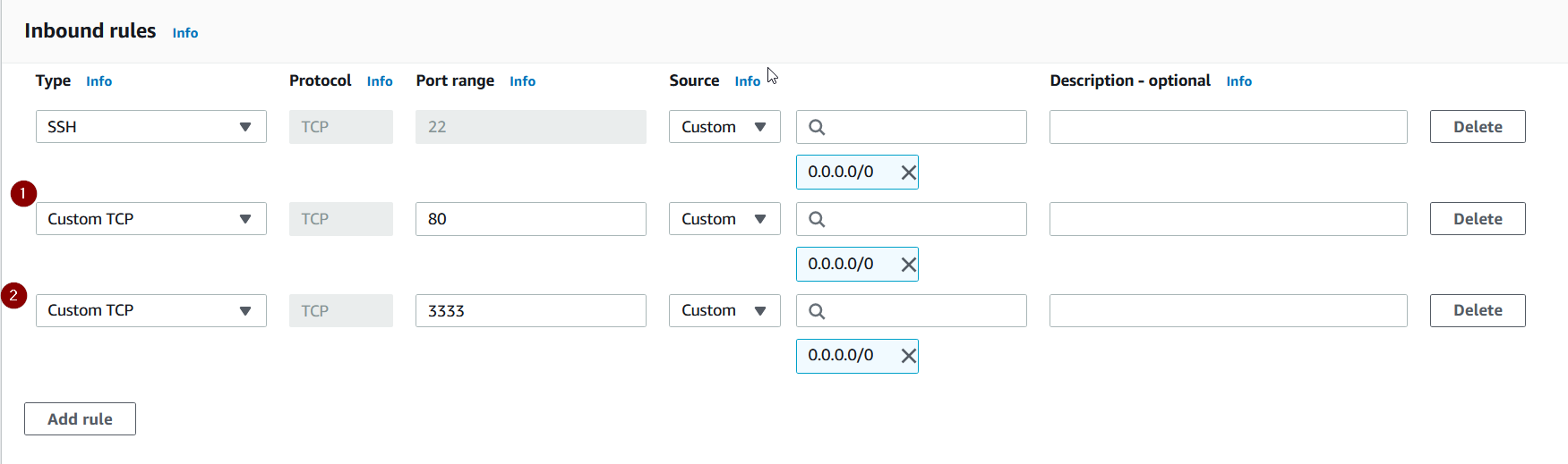 We can edit inbound rules to add two new rules (Custom TCP) which opens port 80 and 3333 and allows traffic to flow through. In the CIDR input, select 0.0.0.0/0
