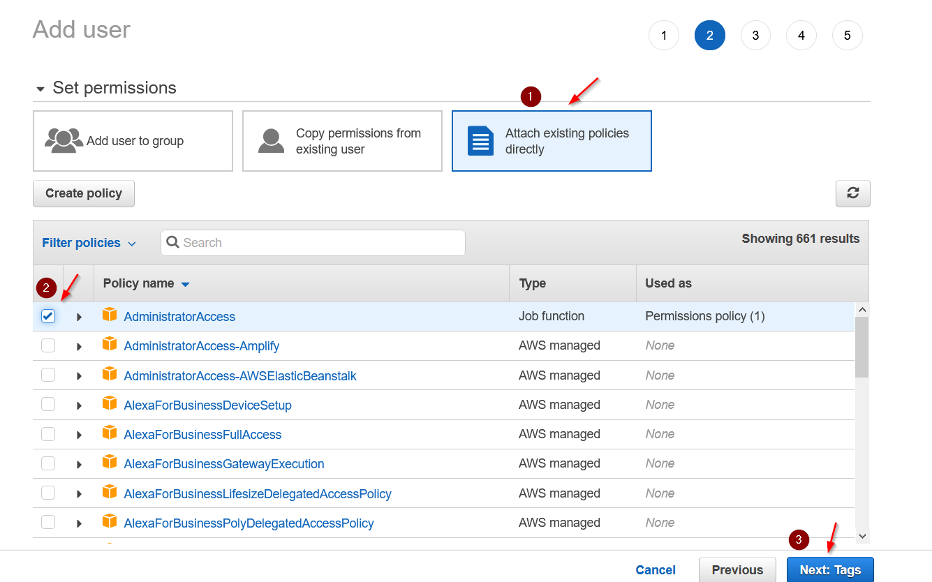 Make sure you have the Programmatic Access box selected. Go to next step where we need to add the AdministratorAccess policy to this user.