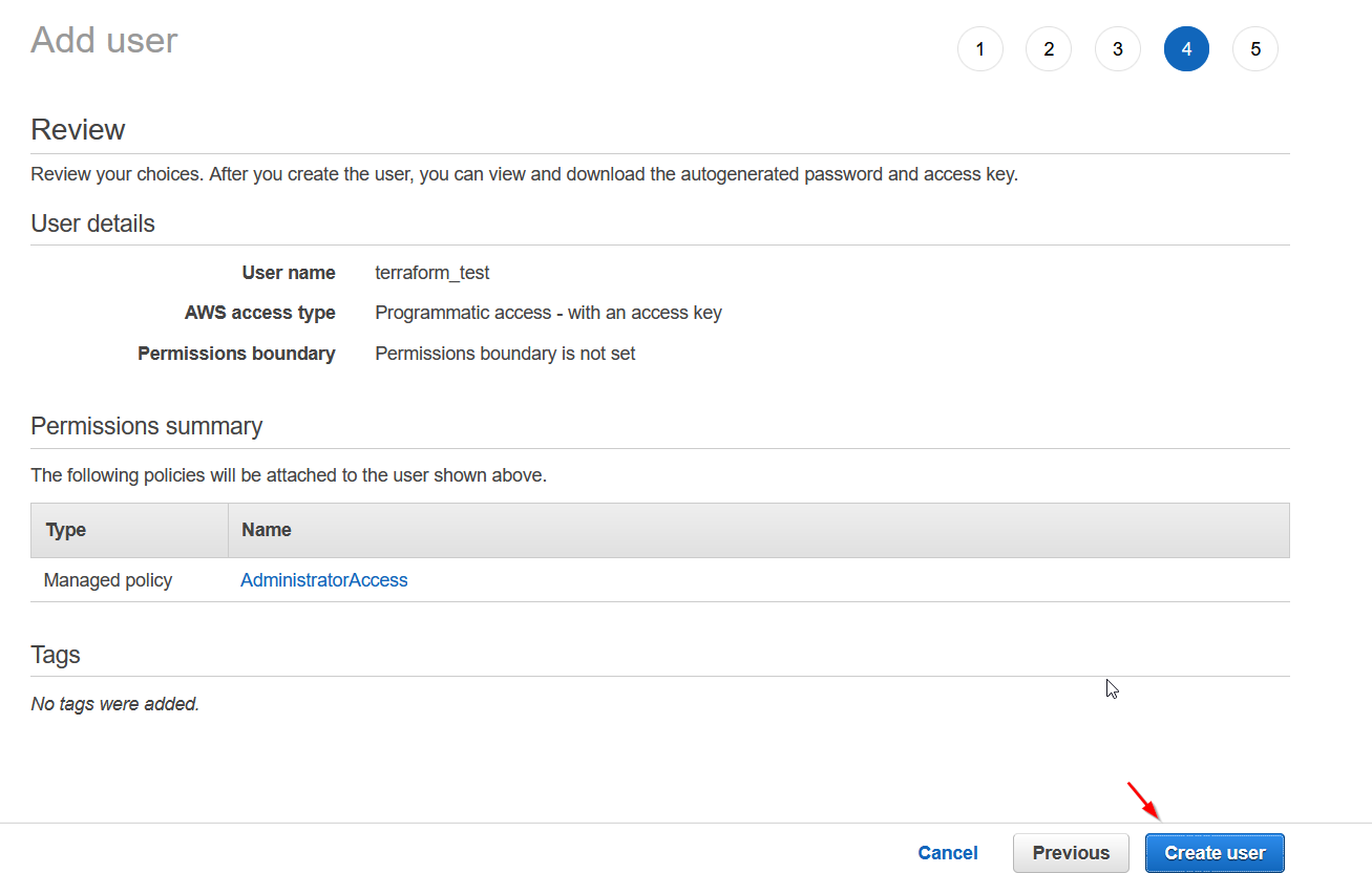 We can skip the next step where it asks to add the tag. Review and then create user.