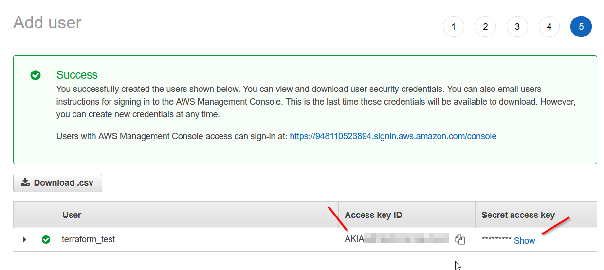 Copy the access key and secret key you got somewhere safe since we need to put it in the terraform configuration.